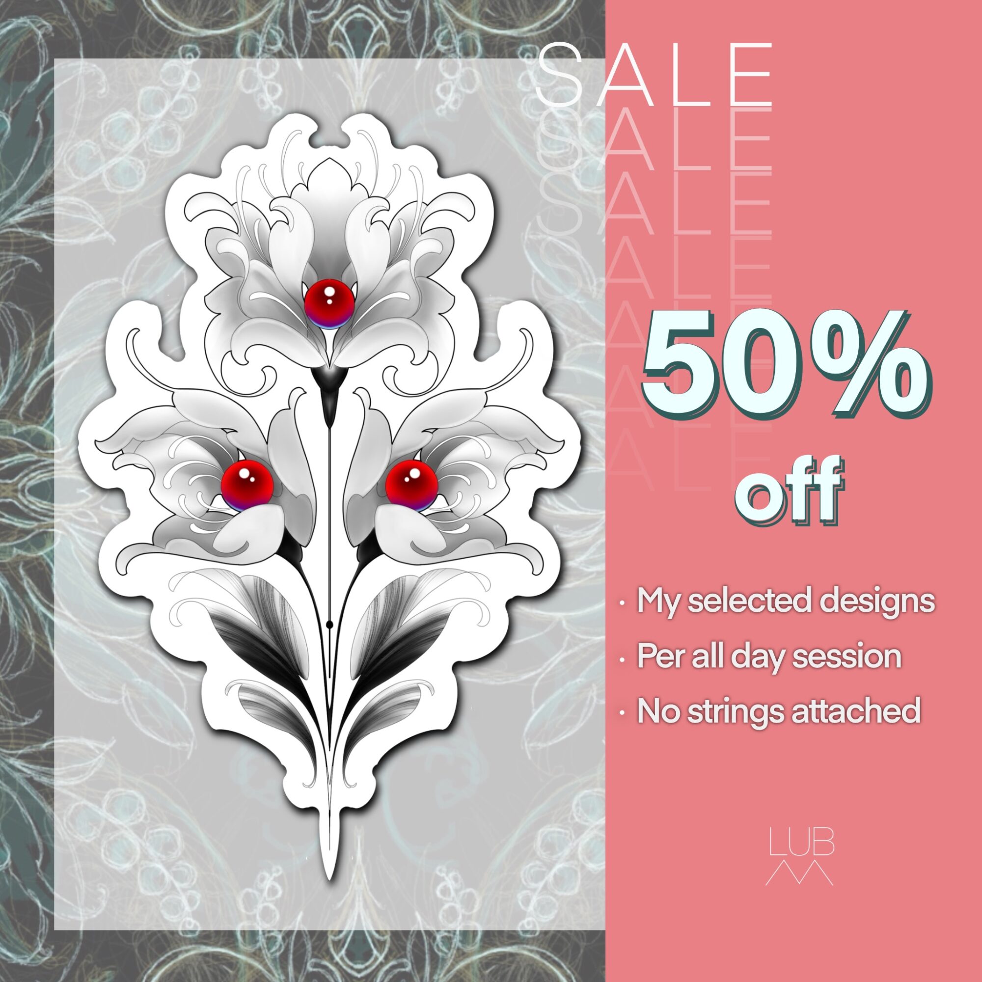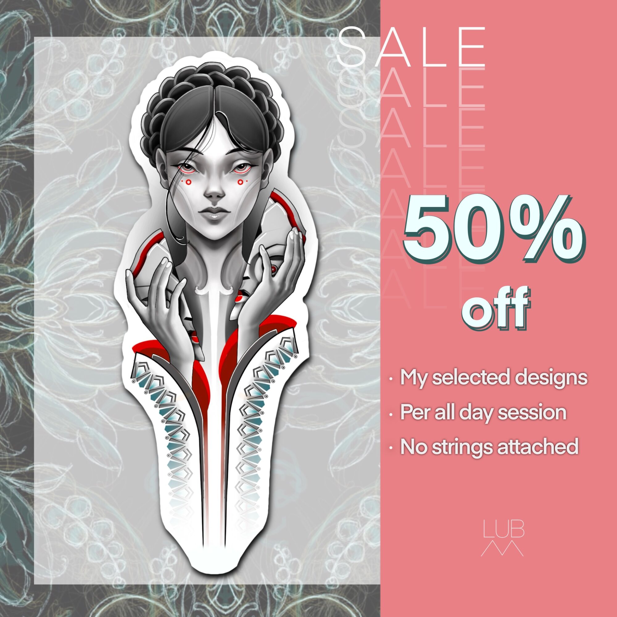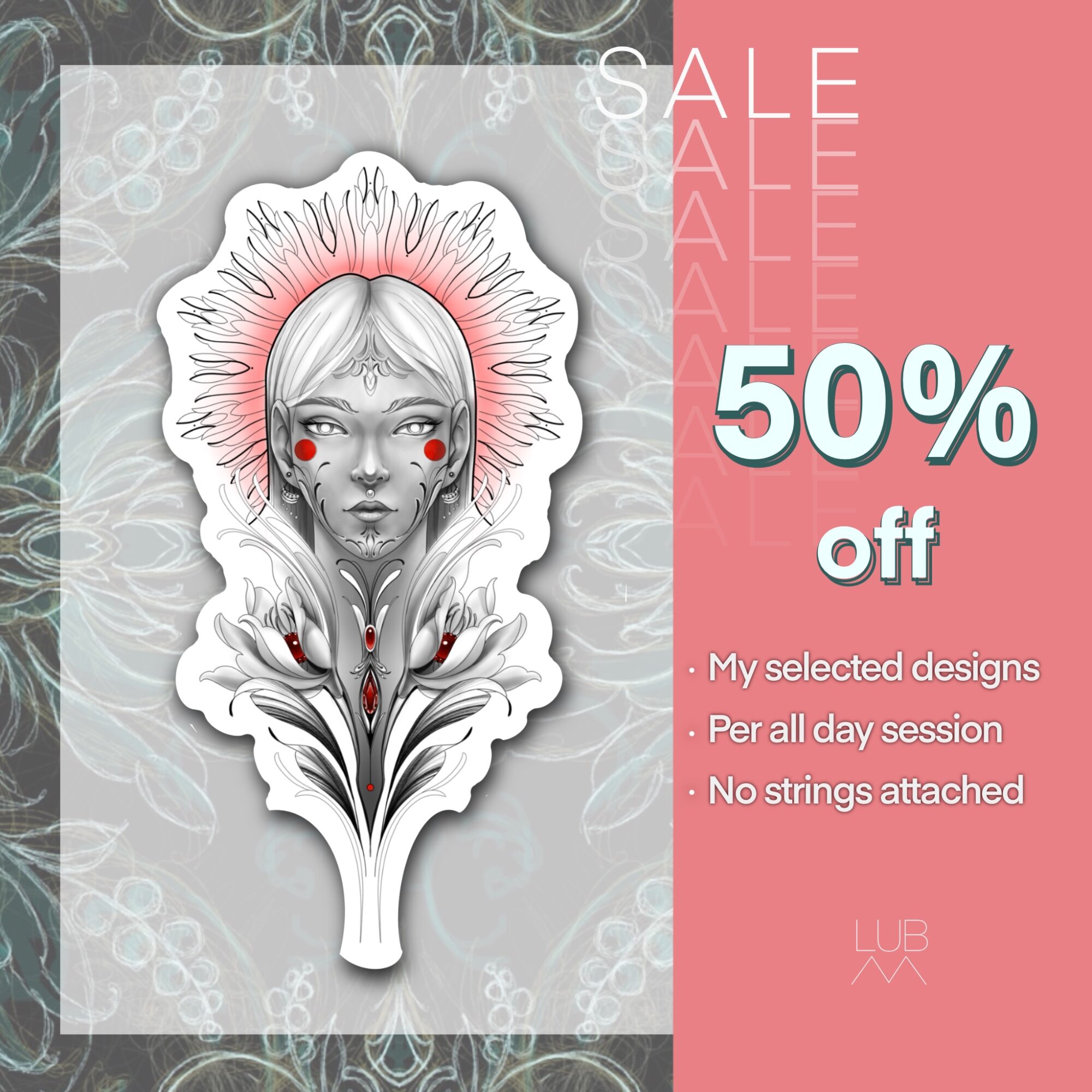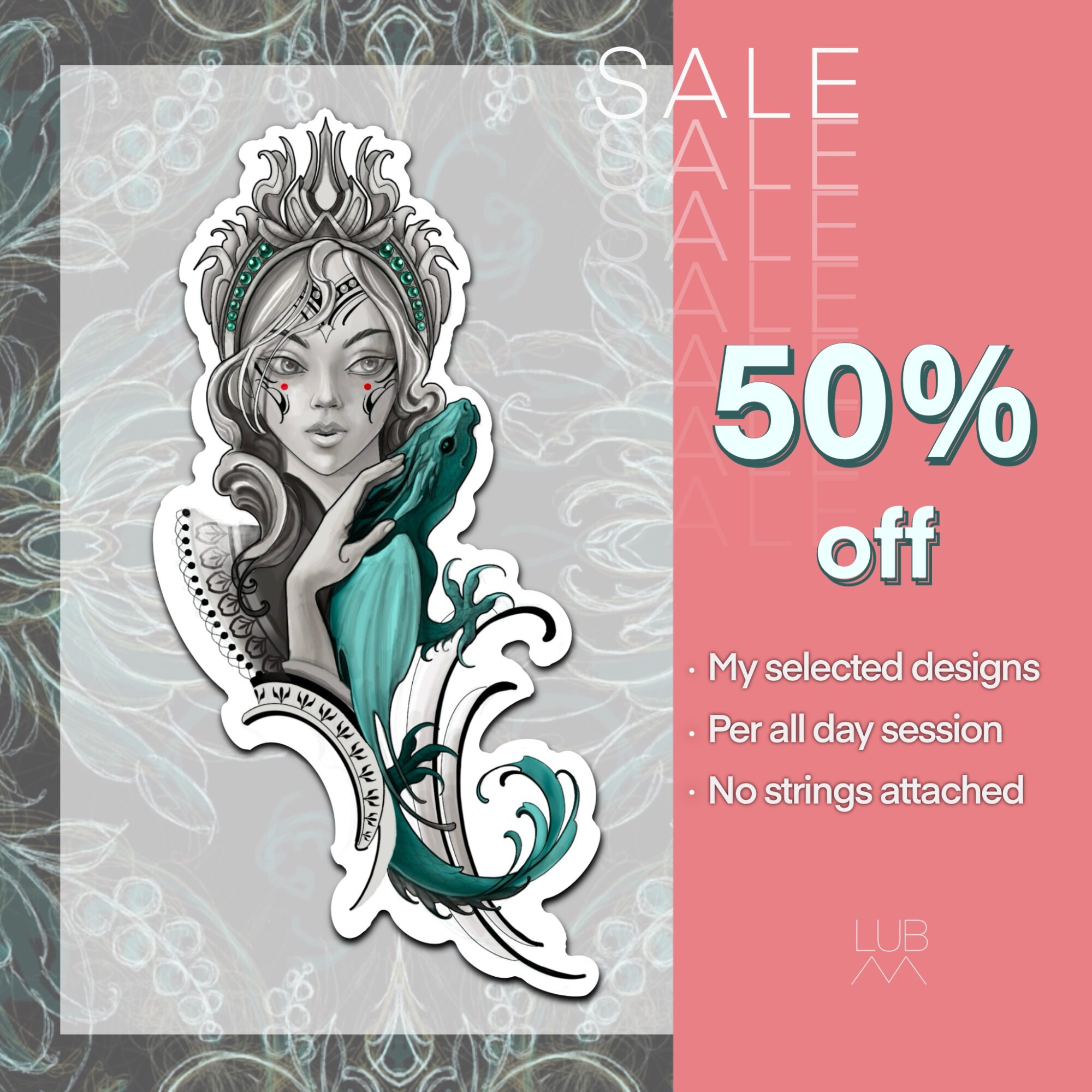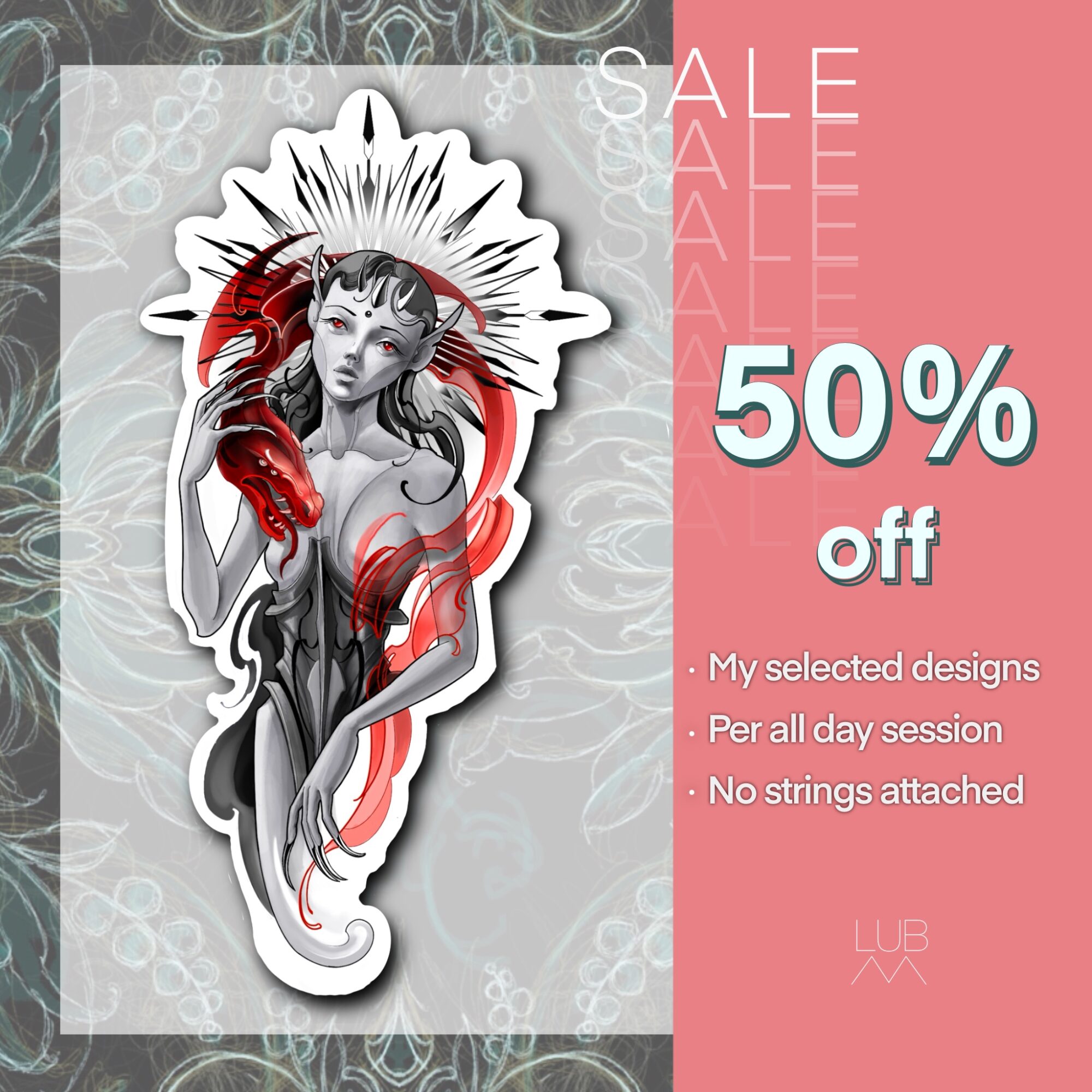 We’re running a special offer: 50% off a full-day tattoo session with Lubava – but only for the custom flash designs shown on this page.